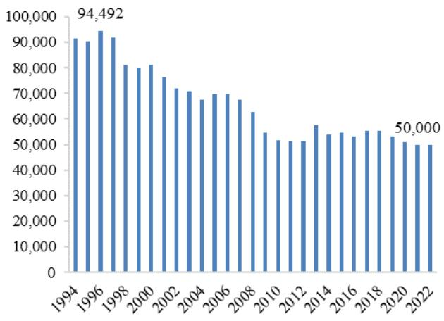 找到了一张过去三十年日本水泥行业产量的图,这张图非常好,给出了很多重要的信息。