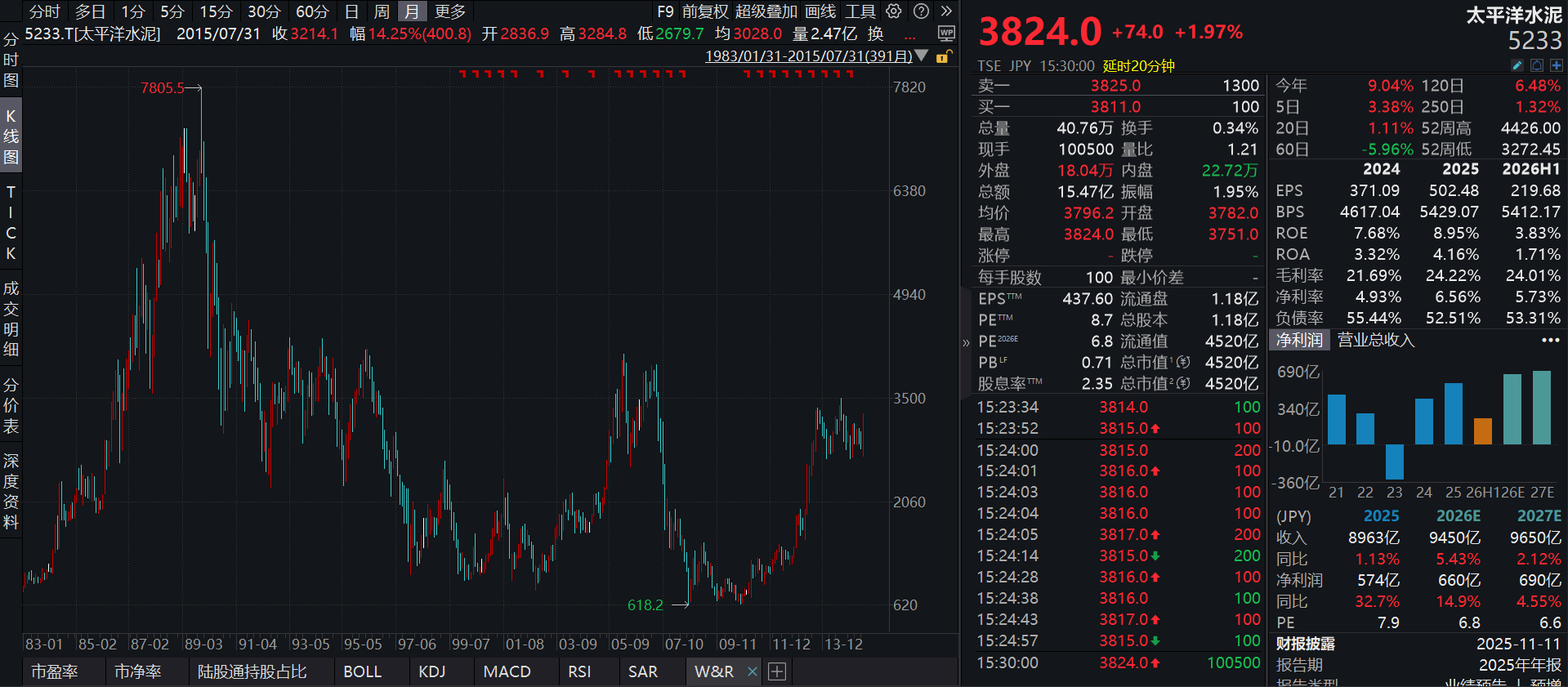 1、太平洋水泥的顶部在89年,和房地产周期一起见顶,最高7800日元。