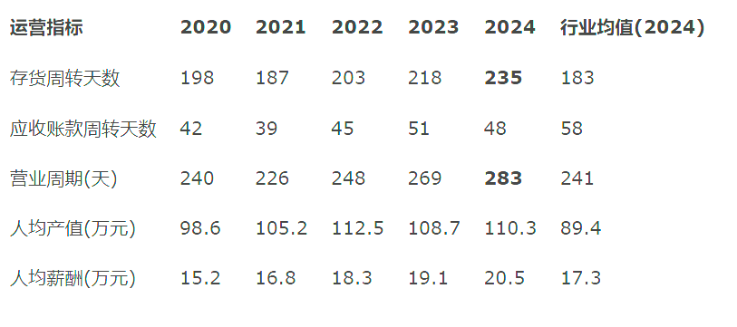 人力资源效能突出:人均产值(110.3万元)超行业均值23.4%,人均薪酬(20.5万元)高于行业18.5%,形成“高投入高产出”模式。这反映了公司人才结构升级(设计、数字化岗位增加)和激励机制优化,支撑其中高端定位战略。