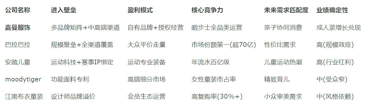 双极分化加速:头部品牌如巴拉巴拉(市占率第一)、安踏儿童(流水百亿)依托规模优势挤压中小品牌;同时,细分龙头如moodytiger(功能面料)、江南布衣(设计师风格)通过差异化生存。