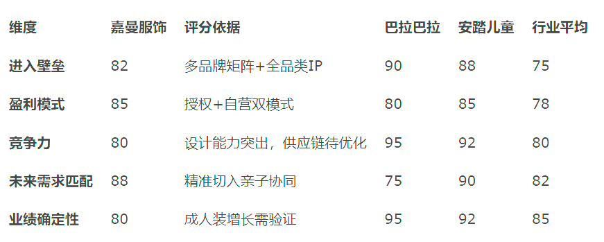 嘉曼壁垒得分82:核心优势在于暇步士全品类IP所有权(非代理)和高端渠道资源(176家直营店)。但较巴拉巴拉(规模壁垒)和安踏(运动科技)仍有差距。