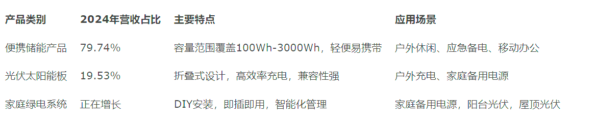 产品销售多元化:公司收入主要来源于便携储能产品(占营收约79.74%)、光伏太阳能板(占营收约19.53%)以及其他配套产品(占营收约0.73%)。公司通过不断拓展产品线,从最初的便携式储能设备逐步扩展到覆盖户外活动、家庭备电、应急救灾等多应用场景的全系列产品。近年来,公司更推出了DIY小型家庭绿电系统和XBC美学曲面光伏瓦家庭绿电系统,进一步丰富了产品矩阵,打开了高端户用储能市场的大门。