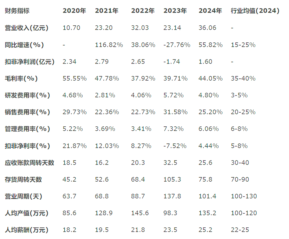 盈利能力方面:公司2024年毛利率44.05%高于行业平均的35-40%,表明公司产品具有较高的附加值和品牌溢价能力。扣非净利率4.44%略低于行业平均的5-8%,主要原因是公司仍处于扩张期,销售和研发投入较大。