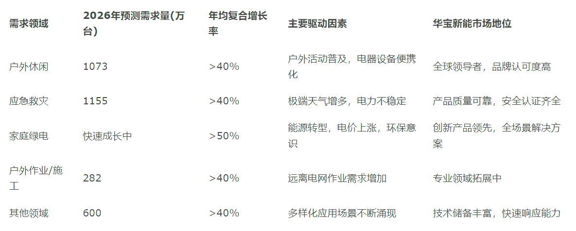 户外休闲市场:随着全球居民生活水平提高和户外活动普及,户外用电需求持续增长。根据中国化学与物理电源行业协会数据,2026年全球便携式储能在户外休闲领域的需求量预计将达到1073万台,年均复合增长率超过40%。华宝新能作为全球便携储能领导者,在这一领域具有明显优势,2025年上半年公司Solar Generator光充户外电源的营业收入同比增长近130%,占比近50%。