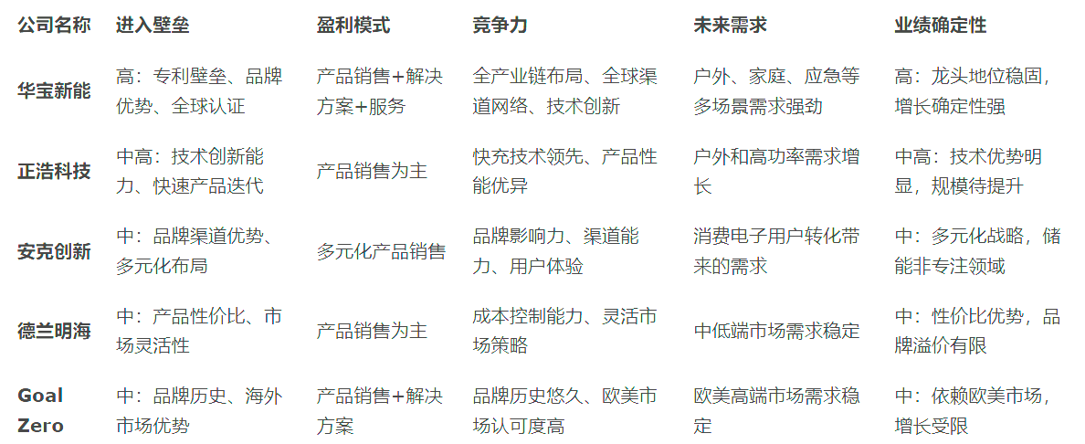 华宝新能:在进入壁垒方面得分最高(90分),源于公司强大的专利壁垒、品牌优势和全球认证体系。盈利模式得分85分,公司正从产品销售向解决方案和服务扩展。竞争力得分90分,体现在全产业链布局、全球渠道网络和技术创新。未来需求得分90分,基于多场景需求强劲。业绩确定性得分85分,龙头地位稳固。