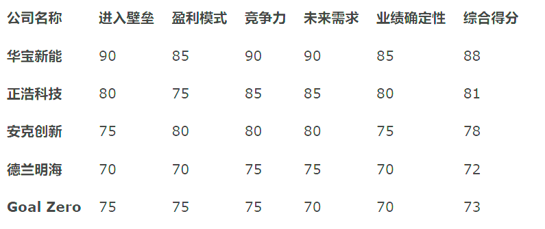 基于进入壁垒、盈利模式、竞争力、未来需求和业绩确定性五个维度,对华宝新能及其主要竞争对手进行百分制评分。