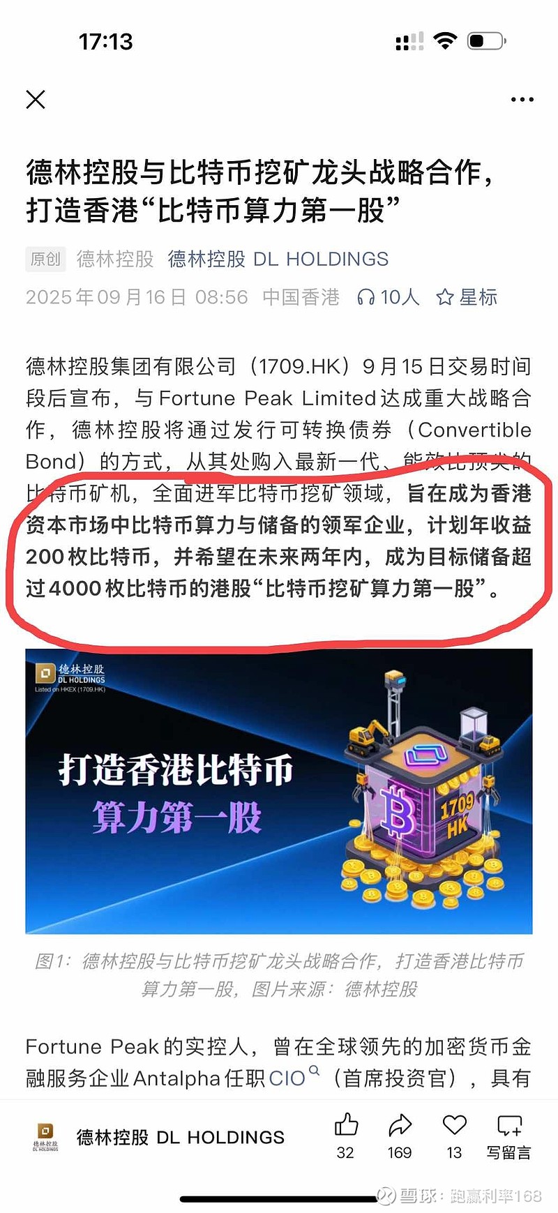 $德林控股(01709)$ 这公众号确定不是在吹牛?就算你这矿机一年可以挖到200枚,两年也才400枚。你这个目标储备超过4000枚怎么做到?现在比特币11.5万美金一枚,4000枚价值4.6亿美金(相当于35.8亿港币)。难道公司还打算花32亿港币再购买3600枚比特币?有这个实力吗?真不是吹牛?不是稿子审核不严?