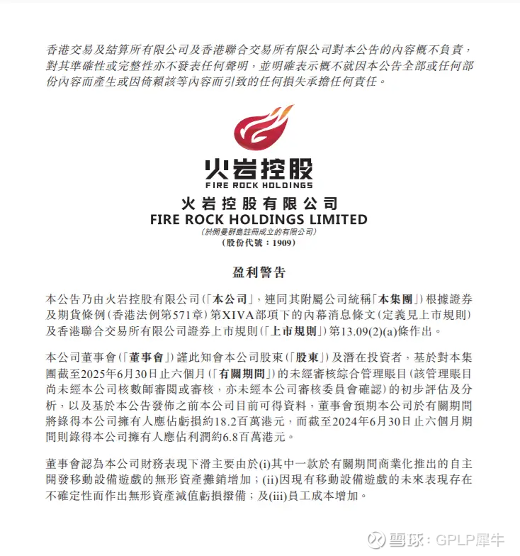 7月31日,火岩控股发布公告:预计公司截至2025年6月30日止六个月将录得公司拥有者应占亏损约1820万港元,而截至2024年6月30日止六个月则录得公司拥有者应占利润约680万港元。