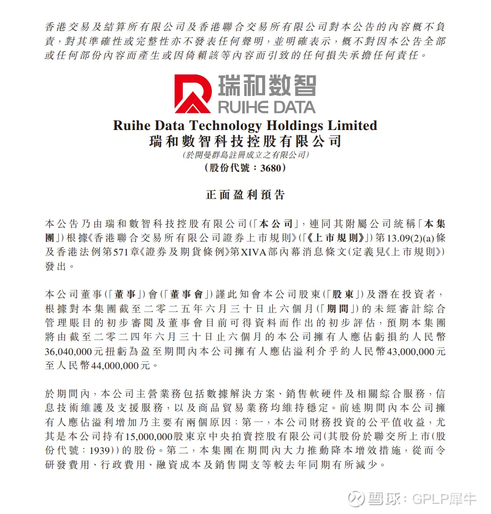 7月31日,瑞和数智对公布上半年正面盈利预告。预告显示,瑞和数智在2025年上半年将录得净利润4300-4400万元。
