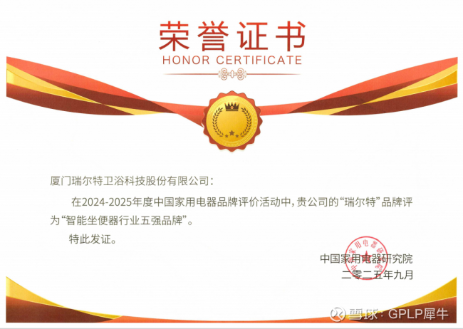 值得一提的是,9月5日在德国柏林隆重举办的“2024-2025年度中国家用电器行业品牌评价活动”,R&T瑞尔特更是凭借其全方位的品牌综合实力,与格力、美的、海尔、西门子等知名企业共同入选《2024-2025年度中国家用电器行业品牌评价结果》榜单,获评 ”智能坐便器行业五强品牌“ ,彰显了其强大的科技竞争力、市场竞争力和品牌竞争力。