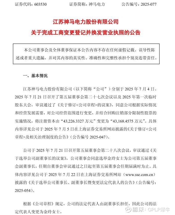同时,根据《公司章程》规定,神马电力的法定代表人由副董事长担任。由于2025年7月21日召开的第五届董事会第二十八次会议审议通过《关于选举公司副董事长的议案》,选举金玲为神马电力第五届董事会副董事长,因此神马电力的法定代表人变更为金玲。