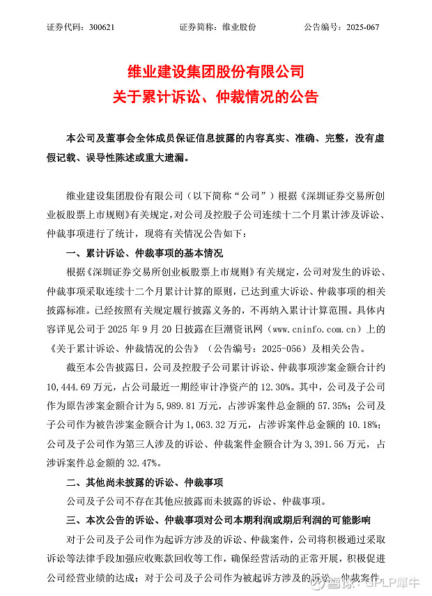 【维业股份:公司及控股子公司累计诉讼、仲裁金额约1.04亿元】
