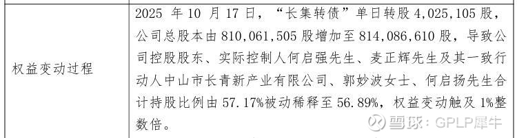 10月20日,长青集团发布公告称,10 月17日,“长集转债”单日转股402.51万股,总股本由8.1亿股增加至8.14亿股,导致控股股东、实际控制人何启强、麦正辉及其一致行动人中山市长青新产业有限公司、郭妙波、何启扬合计持股比例由57.17%被动稀释至56.89%。