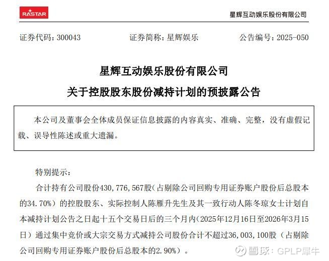 根据星辉娱乐发布的公告,近期收到控股股东、实际控制人陈雁升先生及其一致行动人陈冬琼女士出具的《股份减持计划告知函》,计划公告之日起十五个交易日后的三个月内通过集中竞价或大宗交易方式减持星辉娱乐股份合计不超过36,003,100股(占剔除公司回购专用证券账户股份后总股本的2.90%),原因为“股东自身资金需求”。