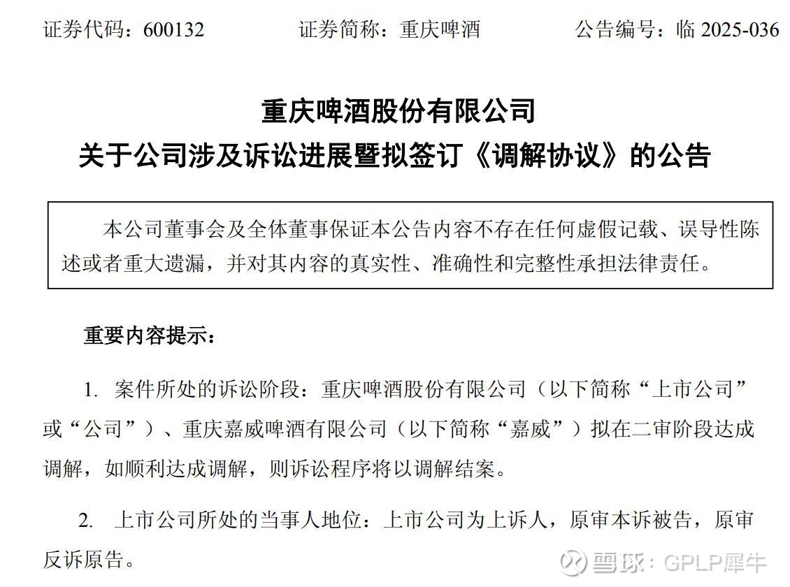 重庆啤酒于2025年3月13日收到一审判决后,向重庆市高级人民法院(简称“重庆高院”)提起上诉。2025年4月17日,重庆高院受理该案。在重庆高院的调解下,双方协商拟签订《调解协议》。