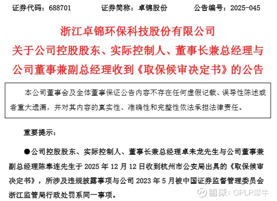 12月15日,浙江卓锦环保科技股份有限公司(688701.SH,以下简称“卓锦股份”)发布公告称,控股股东、实际控制人、董事长兼总经理卓未龙,以及董事兼副总经理陈奉连收到杭州市公安局出具的《取保候审决定书》,二人因涉嫌违规披露、不披露重要信息被取保候审,相关事项与2023年卓锦股份收到的证监会浙江监管局行政处罚系同一案件。