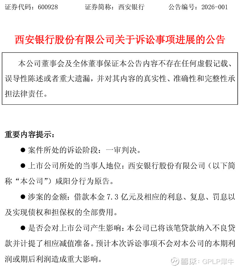 【#西安银行# :咸阳分行获一审判决支持,涉案金额7.3亿元及相应利息】
