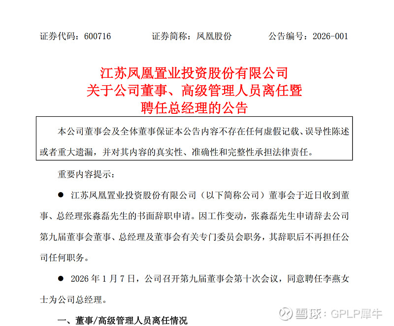 【凤凰股份:张淼磊辞任公司总经理职务,李燕接任】凤凰股份1月7日公告,公司董事会于近日收到董事、总经理张淼磊的书面辞职申请。因工作变动,张淼磊申请辞去公司第九届董事会董事、总经理等职务,其辞职后不再担任公司任何职务,辞职申请自送达董事会之日起生效。同日,公司召开第九届董事会第十次会议,同意聘任李燕为公司总经理,任期与公司第九届董事会任期一致。