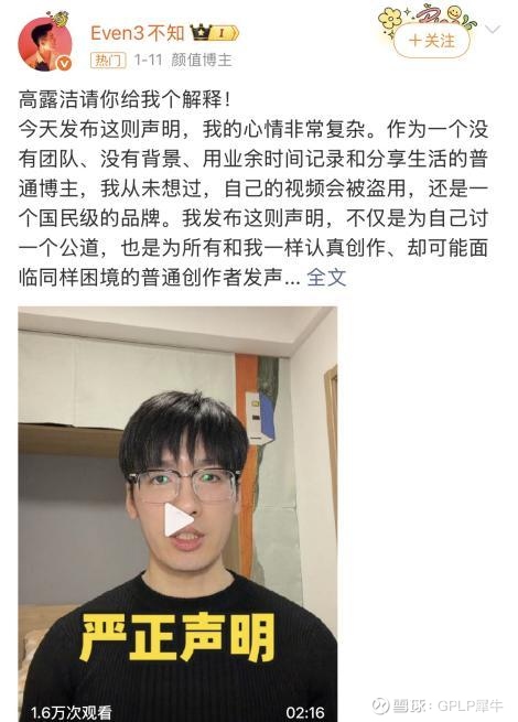 2026年1月11日,一位自媒体博主“Even3不知”在个人微博账号上发布了声明,称高露洁的短视频平台账号搬运其原创内容,并在视频中对其牙齿使用了美白调色效果,还疑使用变声技术嫁接商业宣传内容,希望高露洁能给他一个解释。