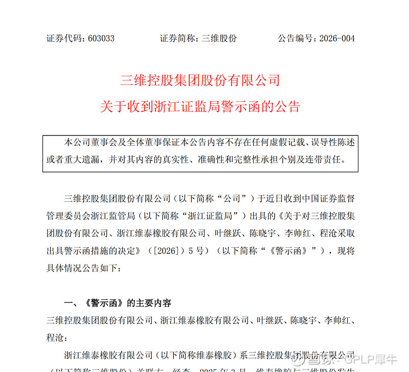 【三维股份:收到浙江证监局警示函】三维股份公告,公司于近日收到浙江证监局出具的警示函。经查,2025年3月,公司关联方维泰橡胶与三维股份发生6000万元资金往来,构成关联方非经营性资金占用,相关款项已归还。此外,三维股份关于控股子公司内蒙古三维新材料有限公司的水权项目完工状态相关信息披露不准确。公司及相关人员将严肃整改,提高信息披露质量,杜绝类似情况再次发生。$三维股份(SH603033)$ @三维股份