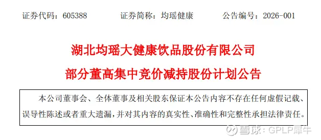 1月15日,均瑶健康(605388.SH)发布部分董高集中减持的公告,董事朱晓明、董事兼副总经理罗喜悦、副总经理向卫兵、财务负责人崔鹏以及董秘郭沁计划在本减持计划公告披露之日起15个交易日后的3个月内,拟通过集中竞价方式减持。