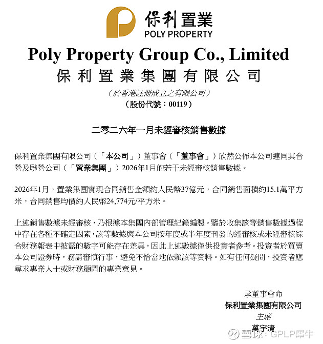 【#保利置业集团#:2026年1月,置业集团实现合同销售金额约人民币37亿元】