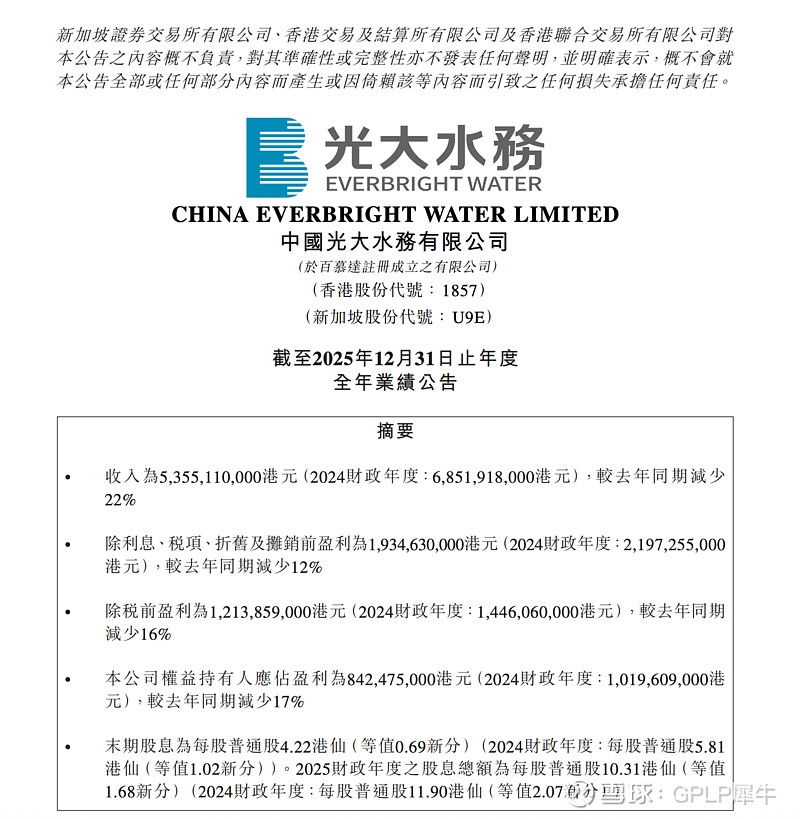 【中国光大水务发布年度业绩,股东应占盈利8.42亿港元 同比减少17% 末期息每股4.22港仙】中国光大水务(01857)发布截至2025年12月31日止年度业绩,该集团取得收入53.55亿港元,同比减少22%;公司权益持有人应占盈利8.42亿港元,同比减少17%;每股盈利29.45港仙,拟派发末期股息每股4.22港仙。期内,建造服务收入减少至10.8854亿港元(2024财政年度:26.4630亿港元),运营收入增加至29.6774亿港元(2024财政年度:28.2098亿港元),财务收入维持在相约水平,为11.0314亿港元(2024财政年度:10.9701亿港元)。本集团的毛利由2024财政年度的26.1746亿港元减少至2025财政年度的23.5792亿港元,降幅为10%。$中国光大水务(01857)$
