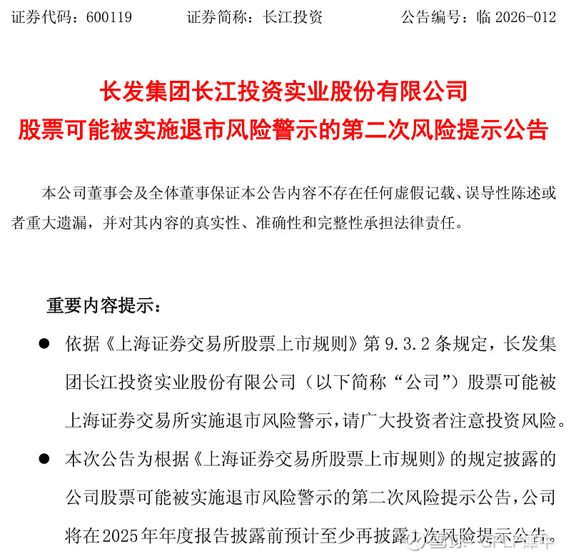 长江投资公告称,经初步测算,2025年利润总额预计-3000万元到-2000万元,归母净利润预计-4500万元到-3000万元,扣非归母净利润预计-4800万元到-3300万元,营业收入预计1.8亿元到2.2亿元,扣除相关收入后低于3亿元。根据规定,公司股票在2025年年度报告披露后可能被实施退市风险警示。若触及相关情形,股票将于年报披露日起停牌,上交所将在停牌5个交易日内实施“退市风险警示”,公司将提前一日公告,次日复牌并实施警示。这是第二次风险提示,年报披露前至少再披露1次。$长江投资(SH600119)$