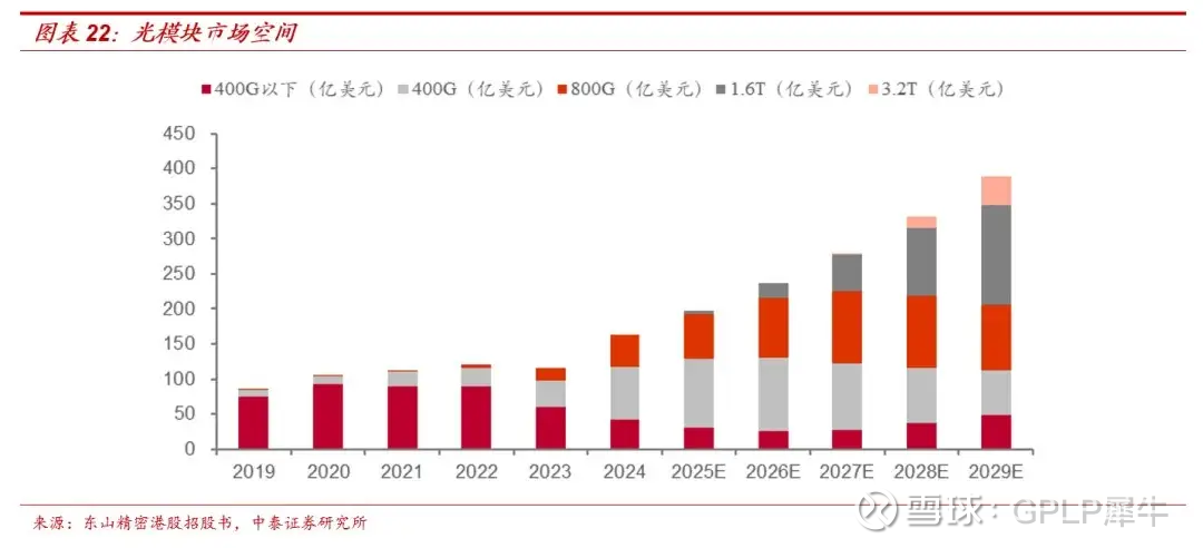 此外,在技术迭代加速下,800G光模块市场规模从2019年的0.5亿美元增至2024年约45亿美元,CAGR达148.5%。1.6T光模块作为下一代方案,预计2029年规模达约143亿美元。3.2T光模块是更远期方向,尚处研发和标准制定阶段,预计2029年后成新增长点。