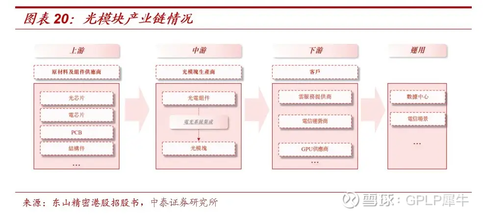 在产业链布局上,上游为原材料及组件供应商,涵盖光芯片、电芯片、PCB以及结构件等;中游为光模块生产商,涵盖光电组件、电光系统集成和光模块;下游涵盖云服务提供商、电信运营商以及GPU供应商等。