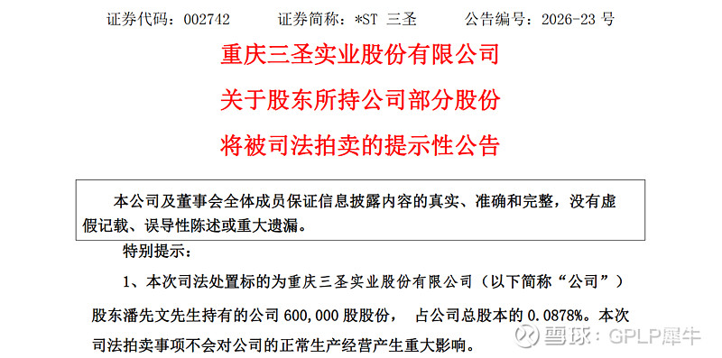 *ST三圣公告,公司股东潘先文持有的60万股公司股份将于2026年3月31日及2026年4月20日分别在京东网司法拍卖平台进行公开拍卖。本次拍卖股份数量占公司总股本的0.0878%,不会对公司生产经营产生重大影响。截至公告披露日,潘先文持有公司股份7185.423万股,占总股本10.5034%,其中累计被司法冻结7185.423万股,已拍卖13496.544万股。拍卖结果存在不确定性,公司将持续关注并履行信息披露义务。
