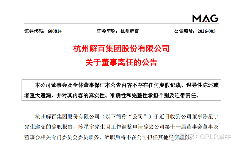 杭州解百公告,公司于近日收到公司董事陈星宇递交的辞职报告,陈星宇因工作调整申请辞去公司第十一届董事会董事及董事会相关专门委员会委员职务,辞职后将不在公司担任其他任何职务。