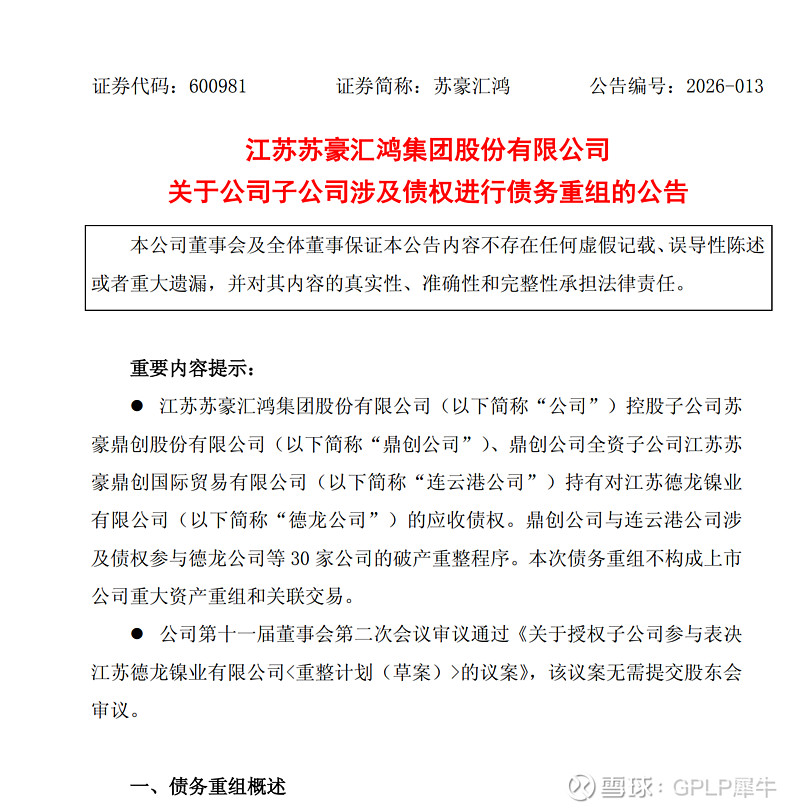 【苏豪汇鸿:子公司涉德龙公司1.80亿元债权参与破产重整】苏豪汇鸿公告称,公司控股子公司鼎创公司及旗下连云港公司持有对德龙公司的应收债权。经重整管理人审查确认,债权总额共1.80亿元,包括有财产担保债权0.29亿元,普通债权1.51亿元。根据法院裁定批准的《重整计划》,债权将以“现金加股权和信托受益权”的方式进行受偿。截至2025年6月30日,公司已计提减值准备2737.50万元,预计减少2025年度归母净利润1232.81万元。$苏豪汇鸿(SH600981)$