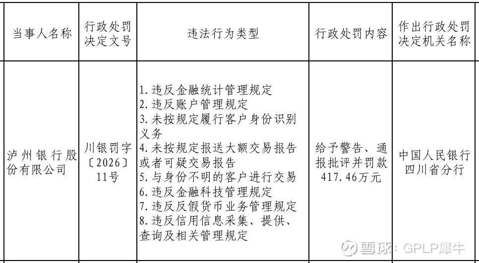 3月20日,中国人民银行四川省分行发布的行政处罚决定信息公示表显示,泸州银行因存在违反金融统计管理规定;违反账户管理规定;未按规定履行客户身份识别义务;未按规定报送大额交易报告或者可疑交易报告;与身份不明的客户进行交易;违反金融科技管理规定;违反反假货币业务管理规定;违反信用信息采集、提供、查询及相关管理规定等8项违法行为,被给予警告、通报批评并罚款417.46万元。同时,泸州银行相关责任人袁某泓以及内控合规部杨某被分别罚款8.5万元。