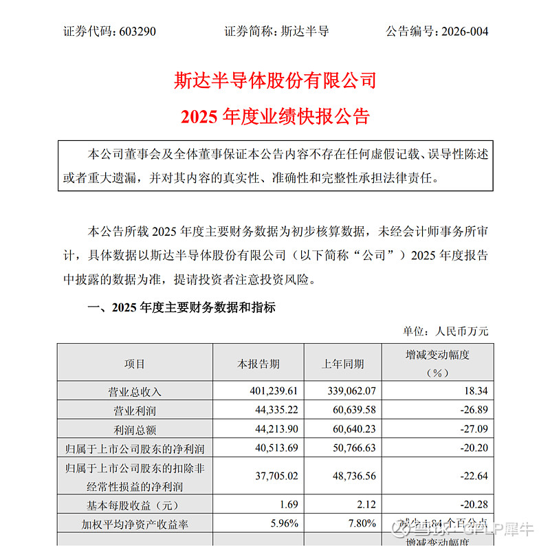 【斯达半导:2025年净利润4.05亿元,同比下降20.20%】斯达半导发布业绩快报,2025年度实现营业总收入40.12亿元,同比增长18.34%;净利润4.05亿元,同比下降20.20%。报告期内,公司营业收入实现稳步增长并创历史新高,新能源汽车、新能源发电(风光储)、变频白色家电行业的需求快速增长为公司报告期收入增长提供核心支撑。同时,公司积极开拓AI服务器电源、数据中心、工业机器人、低空/高空飞行器等新兴应用领域,持续拓展产品应用边界,为公司业务长期打开新的增长空间。$斯达半导(SH603290)$
