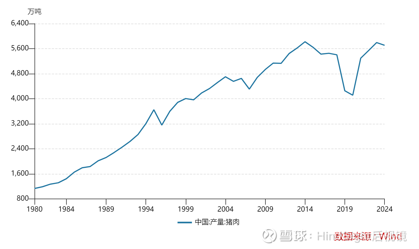 所谓周期,是周而复始,终点回到起点。但看到上面这张图,是不是颠覆了你对传统4年一轮周期的固有印象?从1980年的1134万吨到2025年的5938万吨,改革开放以来中国的猪肉总产量(消费量)足足增长了近5倍。1988年突破2000万吨,1994年突破3000万吨,2001年突破4000万吨,2010年突破5000万吨,2014年突破5800万吨,2025年接近6000万吨。每隔7-10年,中国的猪肉产量和消费量就要迈上一个整数关口。这还是那个周而复始的周期行业吗?