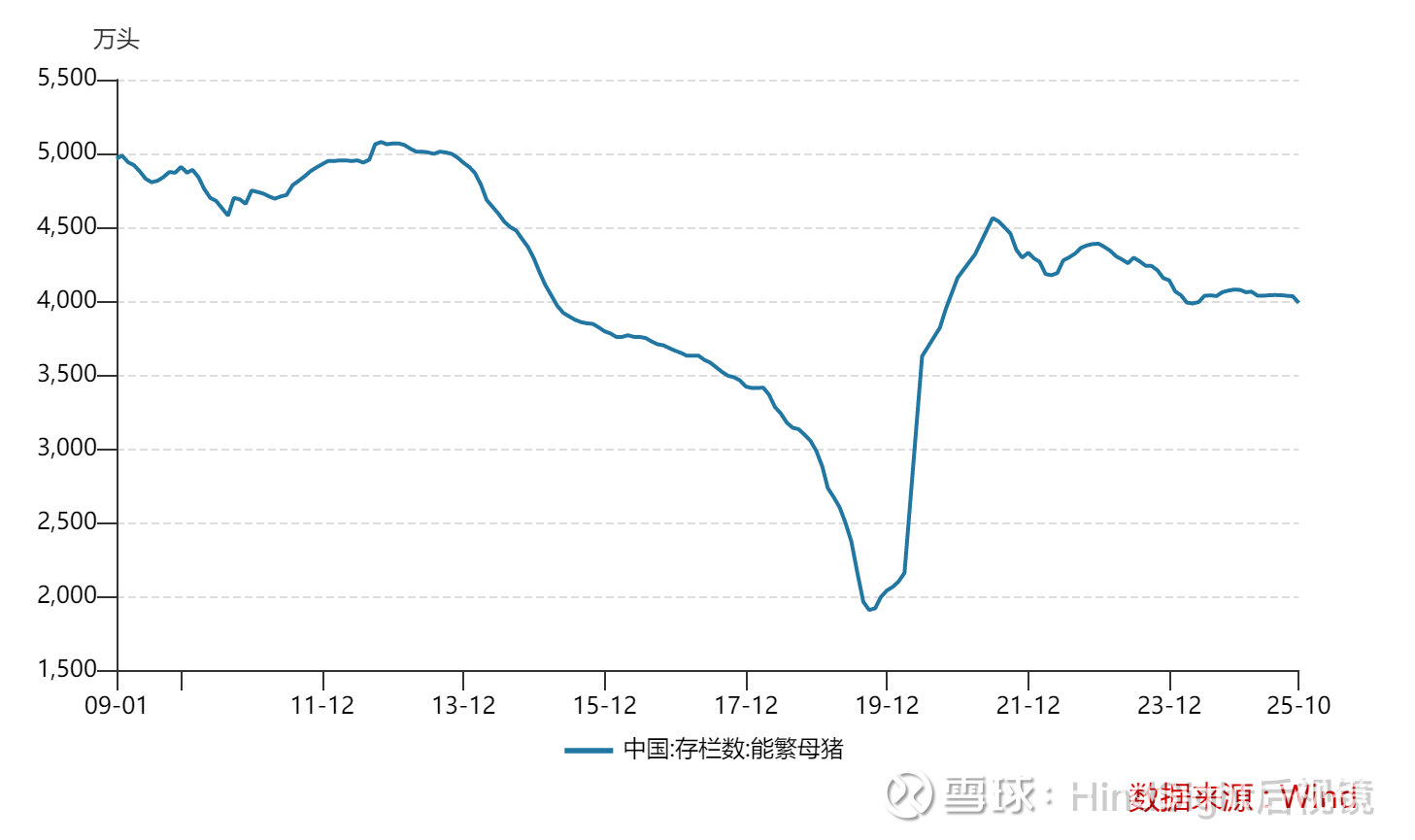 现在的能繁母猪数量是多少?3960万头,较2021年高点4541万头下降了581万头,降幅已经达到12.8%,但周期的影子似乎还没有看到。