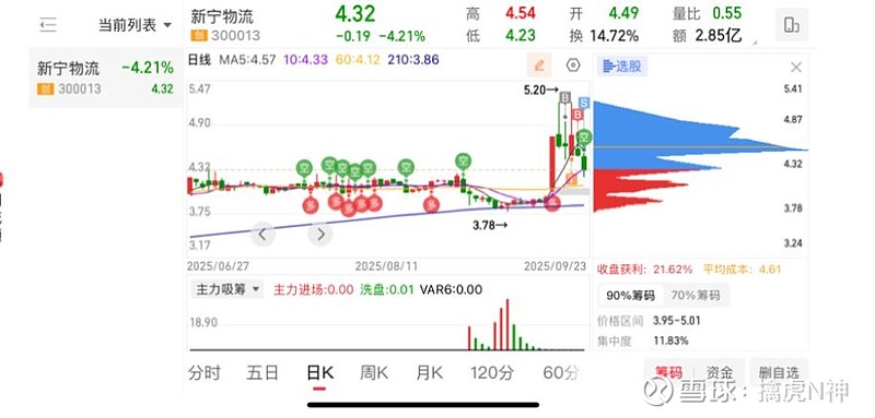 炒股重要的是节奏,赚钱的机会每天都有,就看你能抓到不。$新宁物流(SZ300013)$ 真的是这么暴力的洗盘?还是主力看洗不动出逃了?这几天大单和超大单都没有跑多少,散户关注度也上来了。定格筹码峰是主力坐庄的位置。上方套牢盘和下方获利盘都不算太多,一根大阳就可以收集所有浮动筹码。这个位置缩量、金针,明天应该会高开高走了。走势未来,$全筑股份(SH603030)$ 是一个对标。
