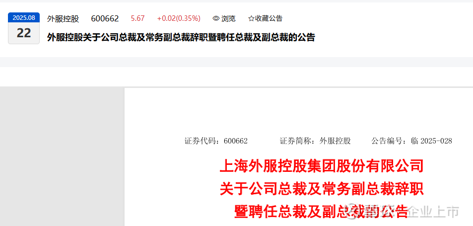 上海外服控股集团股份有限公司(以下简称公司)于近日收到陈伟权先生和朱海元先生的辞职报告。由于工作变动原因,陈伟权先生向董事会请辞总裁职务,辞职后仍将继续担任公司董事长职务;朱海元先生向董事会请辞常务副总裁职务,辞职后仍将继续担任公司董事及董事会秘书职务,根据《中华人民共和国公司法》和《公司章程》的有关规定,相关辞职报告自送达董事会时生效。