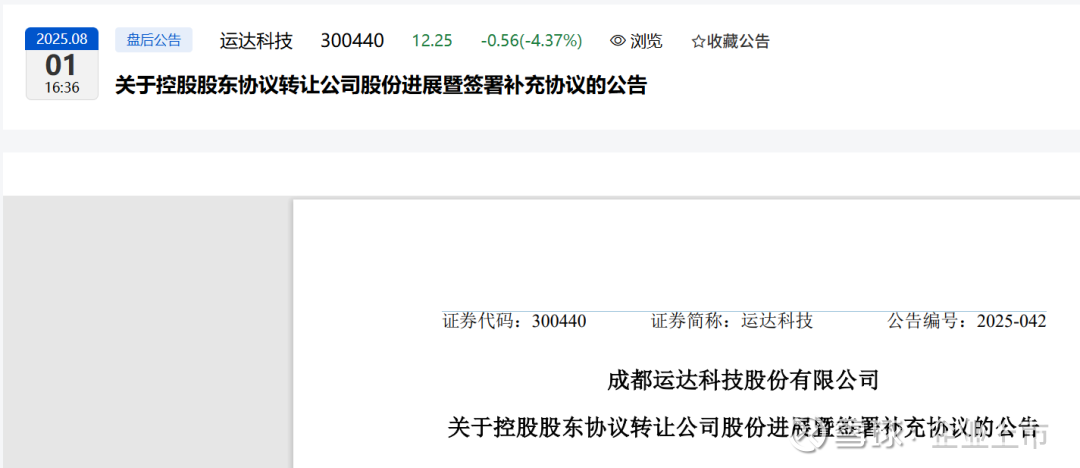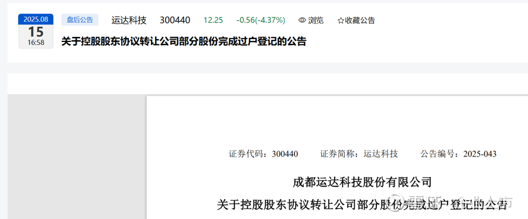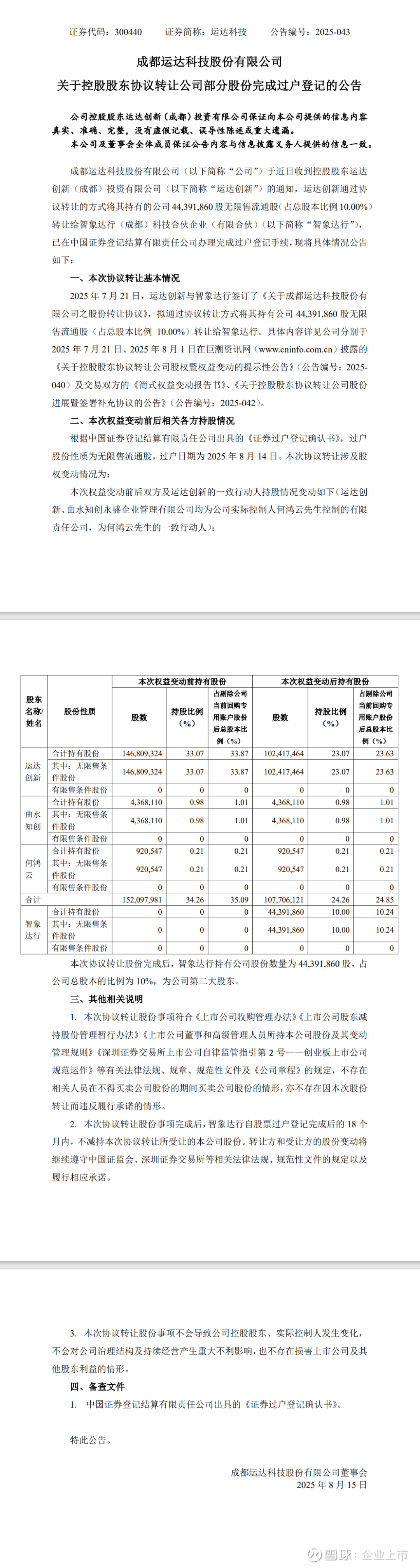 2025 年 7 月 21 日,持有本公司股份 146,809,324 股,占总股本比例 33.07%(占剔除公司回购专用账户中的股份数量 10,521,800 股后的股本 433,396,800 股比例 33.87%)的公司控股股东运达创新(成都)投资有限公司(以下简称“运达创新”)与智象达行(成都)科技合伙企业(有限合伙)(以下简称“智象达行”)签订了《关于成都运达科技股份有限公司之股份转让协议》,拟通过协议转让方式将其持有公司 44,391,860 股无限售流通股(占总股本比例 10.00%)转让给智象达行。具体内容详见公司于 2025 年 7 月 21 日在巨潮资讯网(网页链接)披露的《关于控股股东协议转让公司股权暨权益变动的提示性公告》(公告编号:2025-040)及《简式权益变动报告书》。