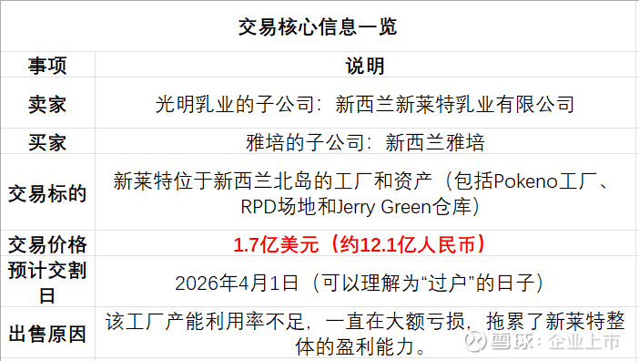 光明乳业准备把它在新西兰的子公司“新莱特”旗下的一家工厂及相关资产,以 1.7亿美元(约合12.1亿人民币)的价格,卖给全球知名的食品公司雅培。