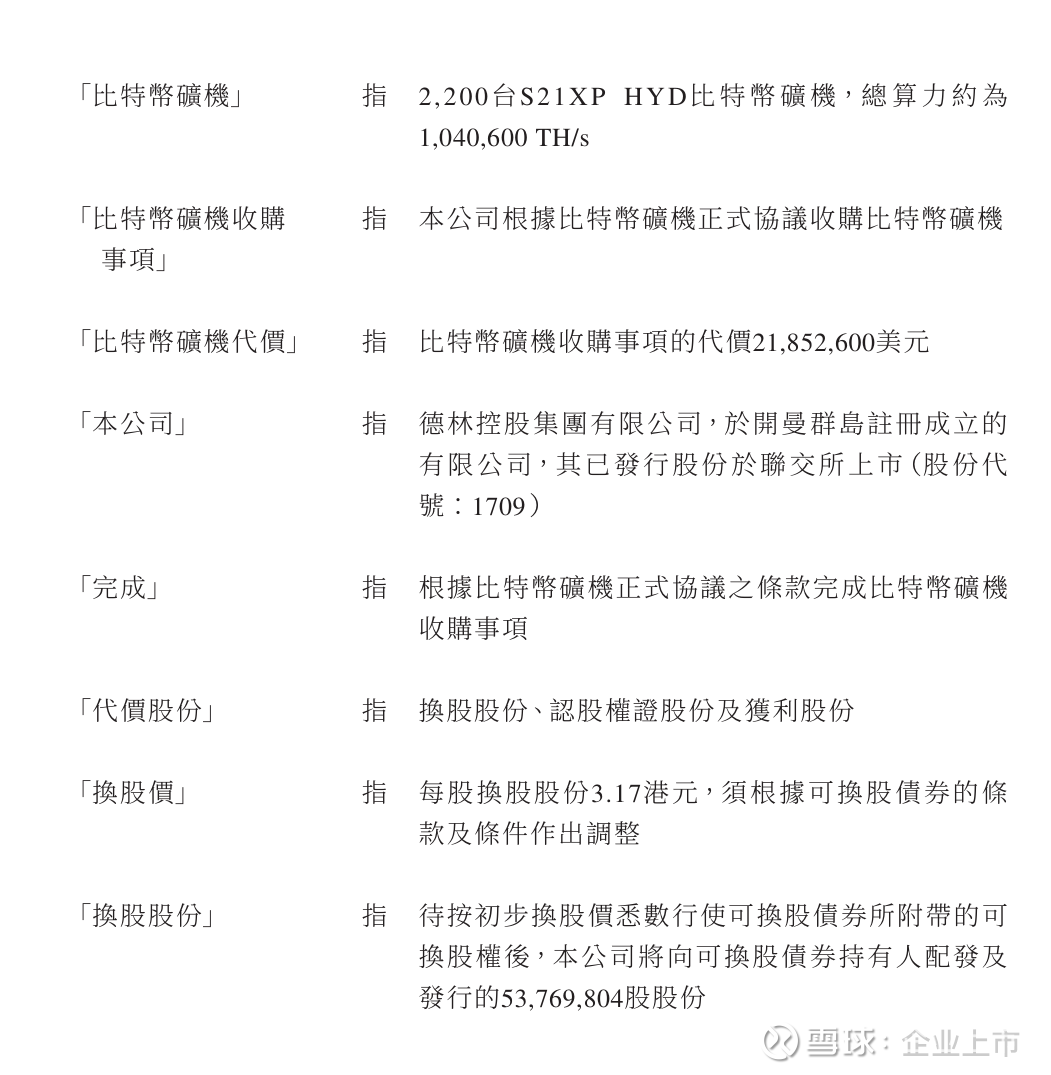德林控股想通过“发股票当钱花”的方式,大规模购买矿机,快速进入比特币挖矿领域。这对公司是战略转型,但对现有股东会稀释股份。交易还在推进中,尚未完全落地。