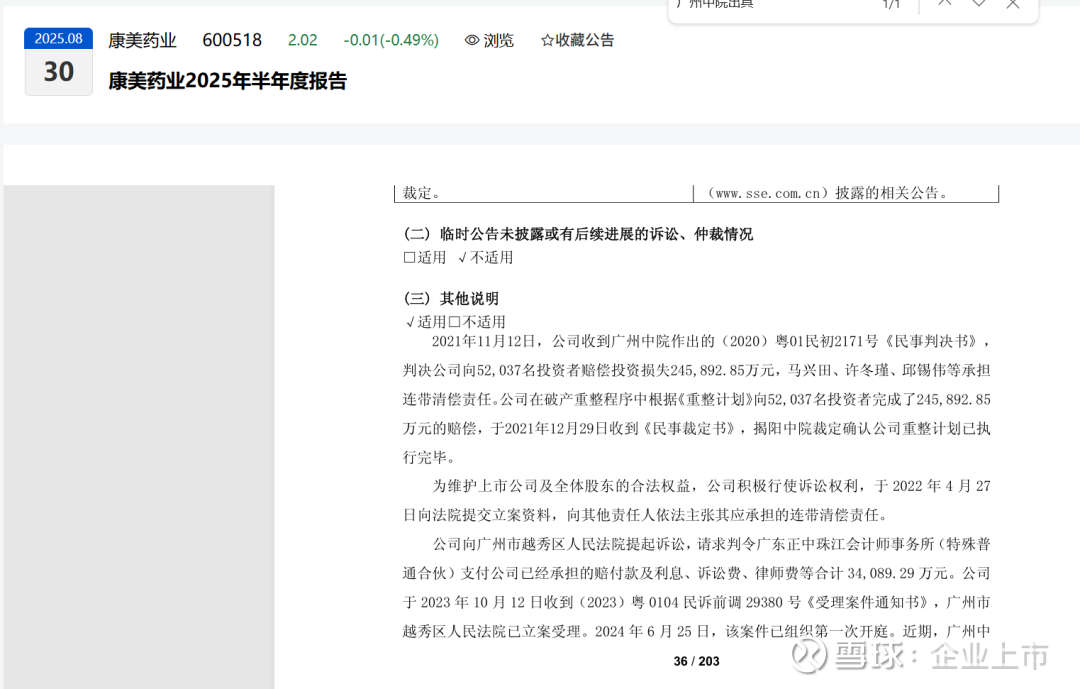 2021年11月12日,公司收到广州中院作出的(2020)粤01民初2171号《民事判决书》,判决公司向52,037名投资者赔偿投资损失245,892.85万元,马兴田、许冬瑾、邱锡伟等承担连带清偿责任。公司在破产重整程序中根据《重整计划》向52,037名投资者完成了245,892.85万元的赔偿,于2021年12月29日收到《民事裁定书》,揭阳中院裁定确认公司重整计划已执行完毕。