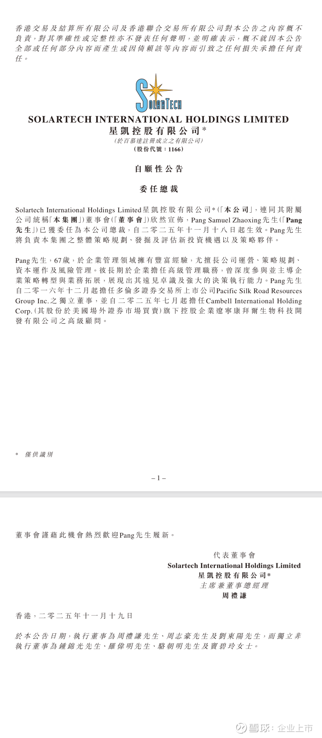 一家在香港上市的、名叫星凯控股有限公司(股票代码1166)的公司发布的人事任命公告。