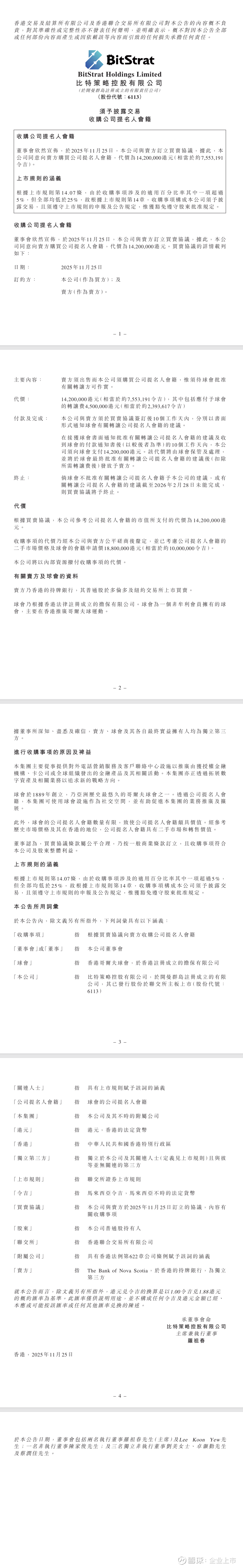 一家叫比特策略控股有限公司(股票代码6113)的上市公司,在2025年11月25日签了个协议,花1420万港元,从一个卖方手里买了一个香港高尔夫球会的“公司提名人会籍”。