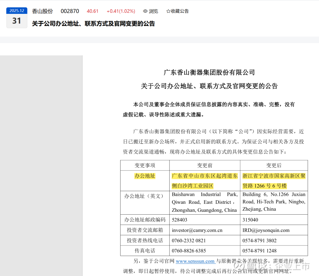 这意味着什么? 这不仅仅是换个地方办公,而是控制权和经营重心的彻底转移。公司从“中山香山”变成了“宁波香山”,完全融入新东家均胜电子的版图。