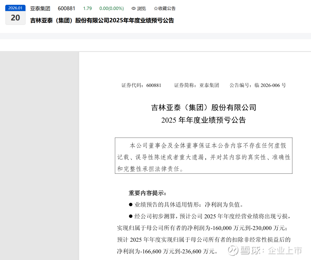 这是亚泰集团自己交出的2025年成绩单预告,非常难看。