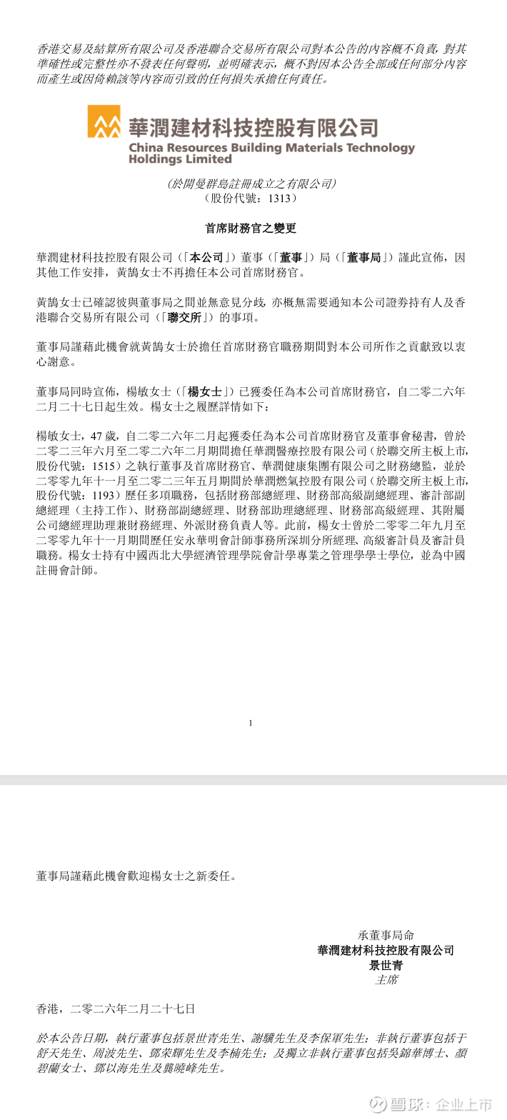 这两份公告是华润集团旗下两家上市公司在同一天(2026年2月27日)发布的人事调动信息,简单来说就是:华润医疗的CFO(杨敏)跳槽去华润建材科技当CFO了,同时华润医疗任命了一位新董事(王跃兴)来接替她的位置。