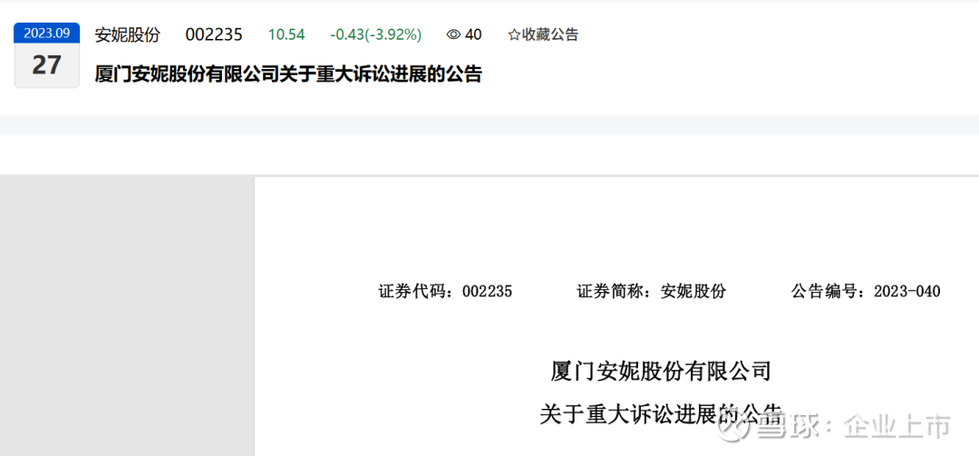 2023 年3月24日,公司收到福建省厦门市中级人民法院传票(2023)闽 02民终2300号。上诉人杨超(一审原告)不服厦门市集美区人民法院作出的(2022)闽 0211 民初 1859 号民事判决书,向厦门市中级人民法院提起上诉请求,具体内容详见公司于2023年3月25日在巨潮资讯网上披露的《厦门安妮股份有限公司关于重大诉讼进展的公告》(公告编号:2023-008)。