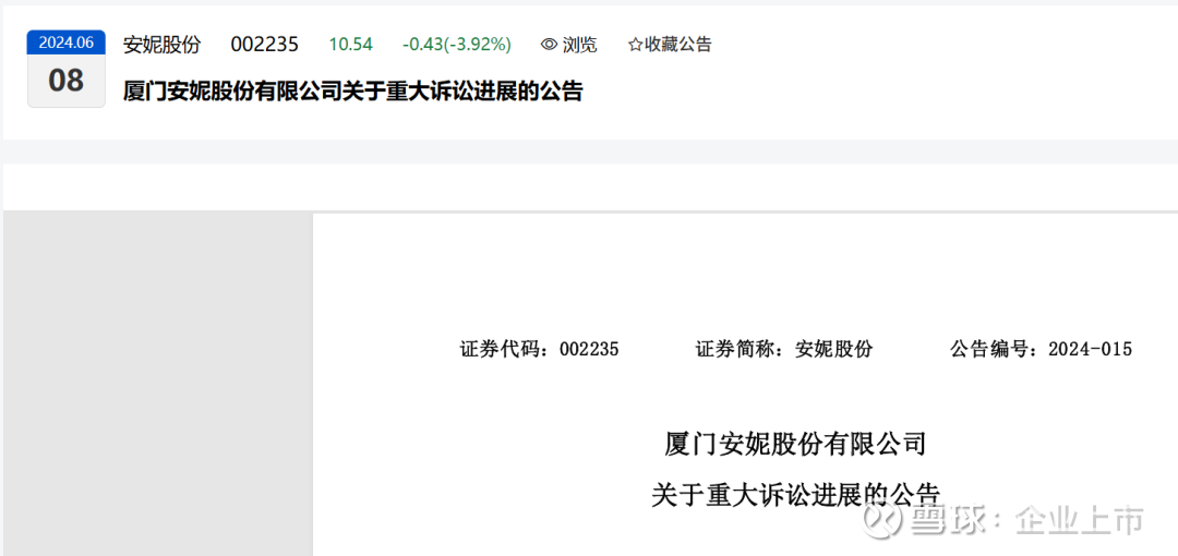 2024 年6月7日,公司收到福建省厦门市中级人民法院出具的《民事判决书》【(2023)闽02 民初505 号】,一审判决结果具体内容详见公司于2024 年6月8日在巨潮资讯网上披露的《厦门安妮股份有限公司关于重大诉讼进展的公告》(公告编号:2024-015)。